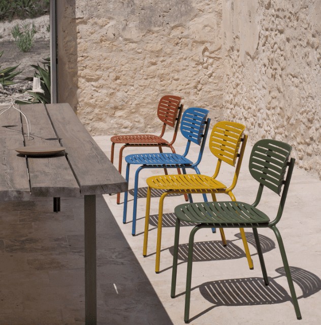 La grande tendance : les assises en tiges d’acier, au design graphique et léger, à compléter avec des galettes d’assise pour plus de confort.